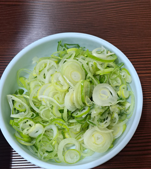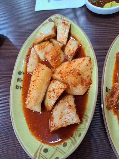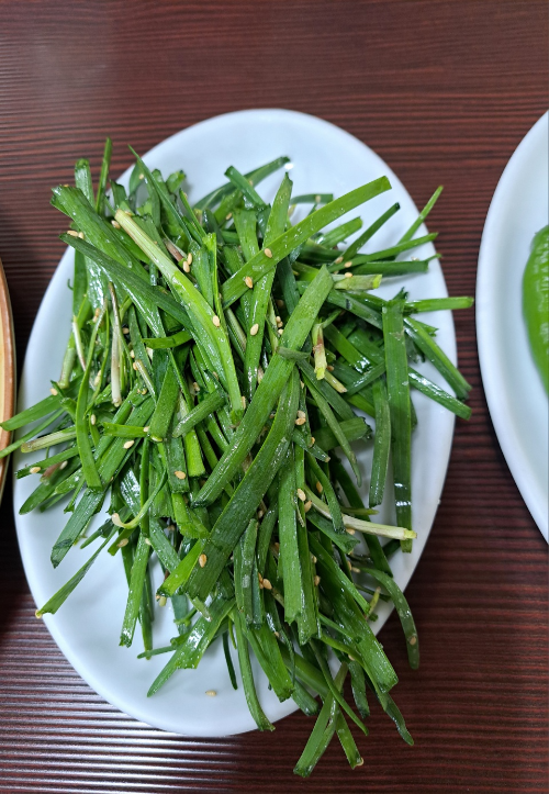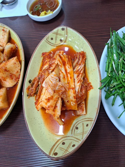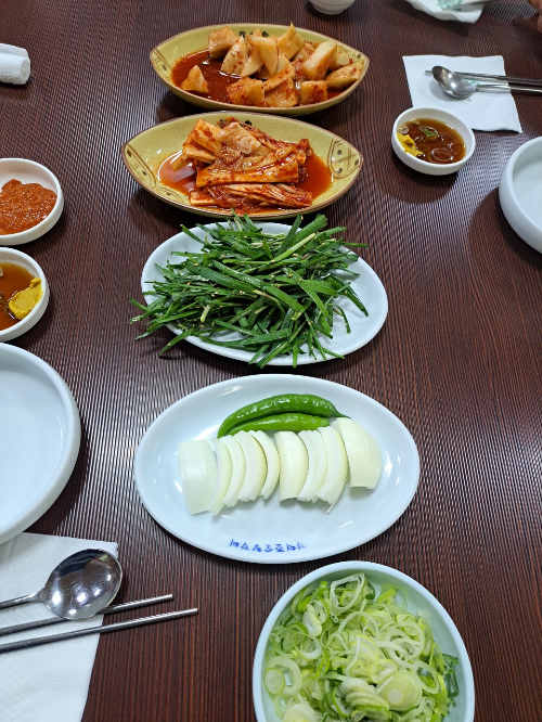 반찬이 먼저 나왔어요. 반찬으로는 깍두기, 배추김치, 부추무침, 생양파, 청량초, 쌈장, 와사비 소스장이 나왔습니다.