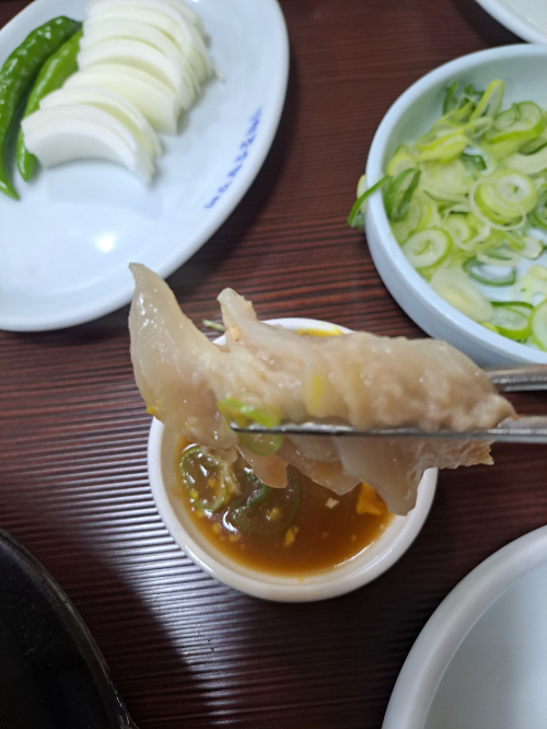큰 뚝배기 속에 도가니도 양이 많았어요.와사비 소스장에 푹 찍어 먹으니 고소함과 그 독특한 식감이 더욱 매력적이었어요.