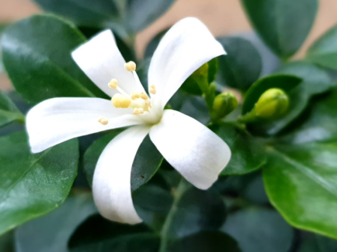 오렌지 쟈스민은 하얀색 꽃이 핍니다.