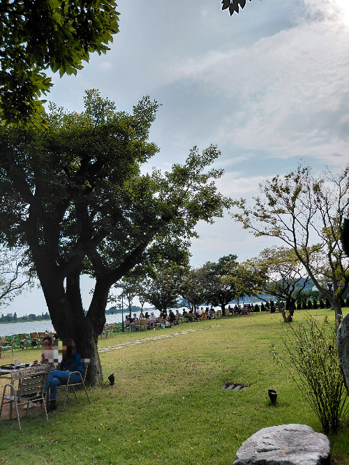 낙동강변에 자리 잡은 흐른 카페에 들어서니 넓은 주차장과 석상, 큰 나무들, 아이들이 뛰어놀기 좋은 잔디마당이 카페를 들어가기 전에 펼쳐져 있었습니다.