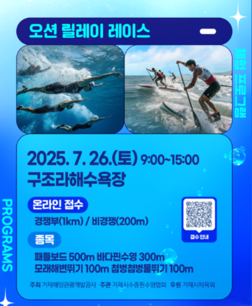 구조라해수욕장에서 열리는 오션 릴레이 레이스는 패들보드, 바다 핀 수영, 모래해변 뛰기, 첨벙첨벙 물 뛰기 등 다채로운 종목으로 구성되어 있습니다. 경쟁부와 비경쟁부로 나뉘어 운영되므로, 실력에 상관없이 누구나 참여하여 바다를 온몸으로 느끼며 즐거운 시간을 보낼 수 있습니다.