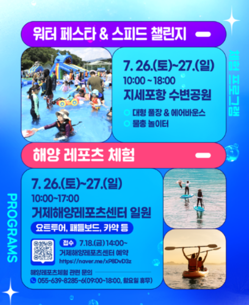 올여름 무더위를 한 방에 날려버릴 짜릿하고 시원한 축제! 경남 거제에서 펼쳐지는 '2025 거제 여름 해양 축제'는 지세포항 수변공원 일원과 구조라해수욕장에서 열립니다. 그러나 최근 전국적인 집중호우 피해상황을 고려해 '2025 거제 여름 해양 축제'를 취소하기로 결정했습니다. 그러나 일부 체험 프로그램은 그대로 진행한다고 하니 안내드립니다. 다소 차이가 있을 수도 있으니 잘 알아보시기 바랍니다.