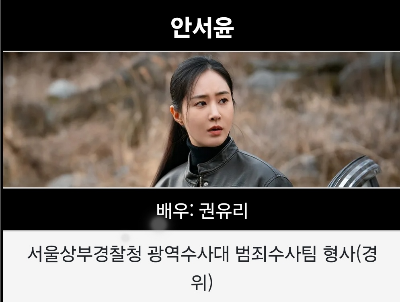 권위주의적이고 업무량 넘치는 광수대 형사로서 여동생을 죽인 진범을 잡기 위해 고군분투하는 언니의 마음이 잘 느껴졌습니다. 강단이 있으면서도 협업할 줄 아는 융통성도 발휘해서 이한신검사관, 사채업자 최화란 등과 함께 범인을 잡는 용감한 모습이 인상적입니다.